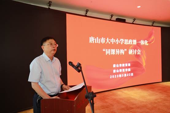 为进一步推进唐山市大中小学思政课一体化建设,促进大中小学思政课教育教学方法有序衔接,5月22日我校与唐山市教育局在北院VR虚拟教学体验中心联合举办唐山市大中小学思政课一体化“同课异构”研讨会。来自全市多所大中小学的七十多名思政课骨干教师参加研讨会。beat365英国官网网站副院长杨涛、唐山市教育局二级调研员李连斌出席研讨会并讲话。beat365英国官网网站执行院长宋晓敏主持会议。