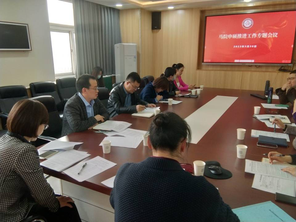 3月30日下午,beat365英国官网网站在南院主楼801会议室召开年内第三次申硕工作推进会。教务处处长王淑娟、科研处副处长秦丹、教务处副处长李志伟出席会议,马克思主义理论学科带头人、学术骨干及beat365英国官网网站班子成员参加会议。马院执行院长宋晓敏主持会议。