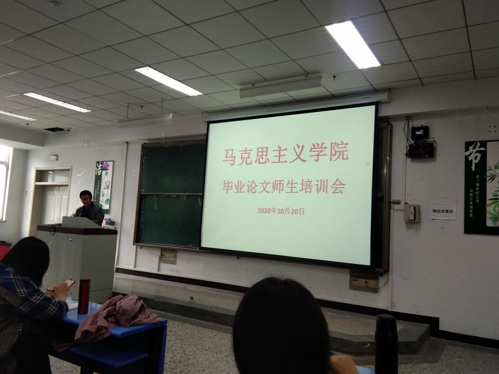 2020年10月20日14时30分,beat365英国官网网站于北院文5阶梯举行毕业论文师生培训会。出席本次活动的有beat365英国官网网站执行院长王学增,副院长宋晓敏,党总支副书记石瑾,各教研室主任,马院所有任课老师,以及2021届毕业生。