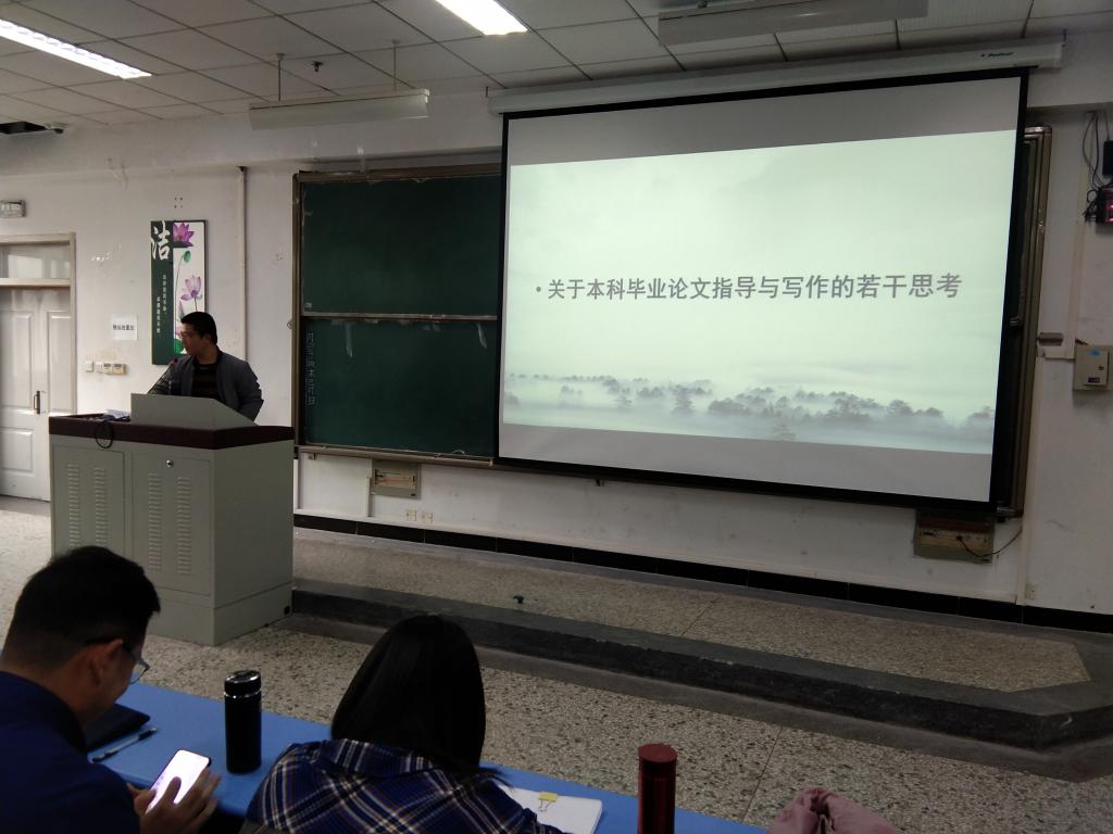 本次主讲老师为王士良博士,王老师从选题、开题、初稿的撰写与审查、文章的修改四个方面进行了详细的讲解,强调了初次选题的日期和时间的紧迫性。随后,对毕业论文的总体要求、时间安排、写作质量等几方面要求进行了细致的讲解,老师同学们均收获颇丰。